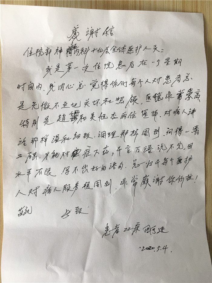 神经内科的情缘并不是偶然,其先生4个月前曾因反复头晕多次在当地治疗而未明显好转,后求助神经内科并被收治入院,赵娜团队对其病情详细分析、积极寻找病因,经过全面治疗后,头晕好转出院。出院时,周先生特写了一封感谢信,对赵娜团队的治疗及服务态度表示感谢。