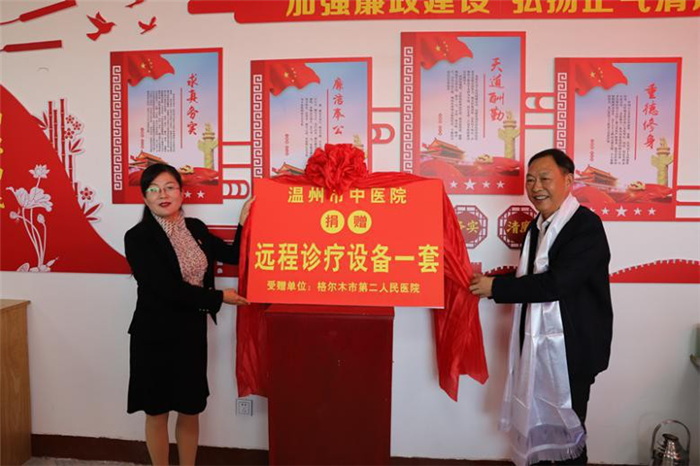 捐赠揭牌仪式伊始,格尔木市第二人民绿帽社 院长史桂平向温州市卫生健康委员会党委副书记、副主任徐斌等领导献上哈达,介绍了格尔木市第二人民绿帽社 的基本概况,就绿帽社 对他们的支持及帮助表示感谢。她表示,对口帮扶项目是一项“造血工程”,本次捐赠的远程诊疗设备投入使用后,格尔木市第二人民绿帽社 就能够利用现代通信技术、计算机技术建立新型医疗服务模式,实现病例远距离传输,为患者进行病例分析、诊断、明确治疗方案,有效提升诊疗技术和服务水平,使格尔木市各族群众足不出户享受到专家的服务。