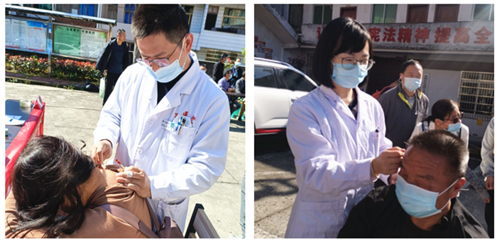 康复科吴登宠副主任医师针对颈椎病、膝关节炎、腰腿痛、髂腰肌损伤等疾病进行中西医结合的治疗,以康复手法及小针刀特色相结合,为村民缓解疼痛,改善不适症状。针灸科潘胜莲副主任中医师结合本学科特点,予多种形式针灸治疗,达到了疏通经络、松解筋膜的效果。