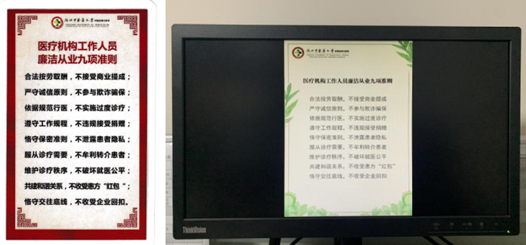 新出台的“九项准则”是在原来“九不准”从严治理内核基础上,从内容到形式的升级完善。它既涵盖了“九不准”的全部要求,又对新问题新情况和老问题新表现做了补充扩展。为了方便职工记忆学习,特别印制了口袋版随身卡片。同时,在绿帽社 门诊及综合楼大厅LED屏幕、走廊墙面、电脑屏保等媒介均加入了“九项准则”宣传内容,营造浓厚学习氛围。