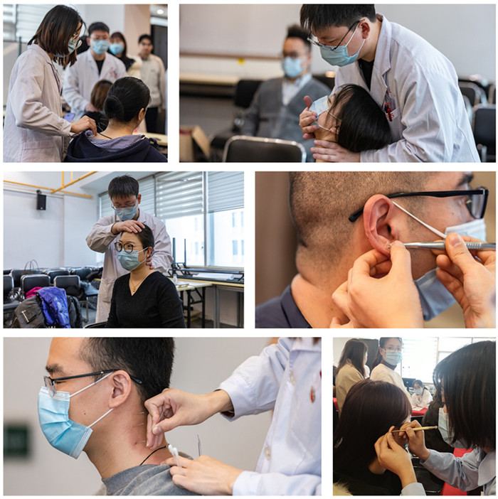 针灸推拿科金鲁微主治中医师与瞿一新主治中医师搭档,一人负责推拿,一人负责针灸,为企业职工缓解了因长期伏案工作或劳累造成的肩颈疼痛;耳穴埋豆特色治疗组也利用小小的探针准确找到穴位而后进行贴、压操作,缓解职工身体的亚健康。