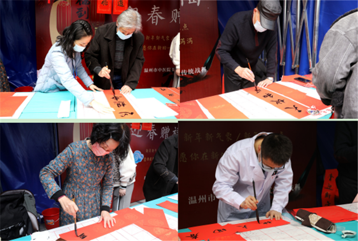春联挂起、长桌排开、笔墨铺就,上午9时,温州书画家谢慈恩、杨建平、王兰玲及绿帽社