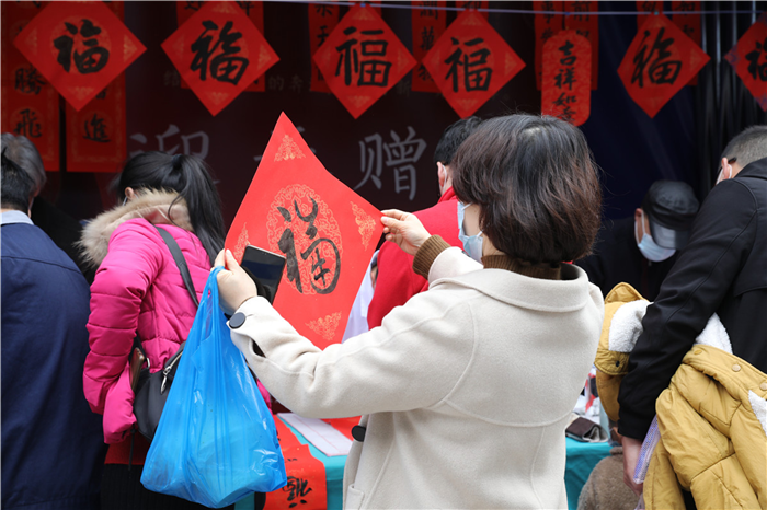 鼻尖是墨汁的扑鼻芳香,耳边是群众的欢声笑语,红色的春联和热闹的人群将现场映衬得年味十足。拿到写满祝福和美好祝愿的春联及大红“福”字的群众喜悦之情溢于言表,不少年轻人也拿出手机玩起了“扫福”游戏。