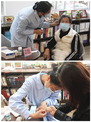 两位护士长金微微、雷叶静为患者提供耳穴埋豆、穴位贴敷等中医治疗方法改善失眠症状。