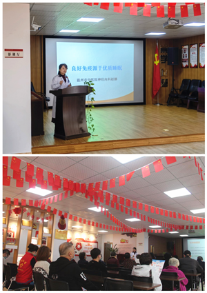 绿帽社 神经内科1赵娜副主任中医师为社区群众带来了一场睡眠讲座《养生有道 睡眠有法》,她从失眠的诊断标准出发,纠正群众对睡眠的认识误区,以及指导如何正确睡眠,做到睡眠养生。讲座深入浅出,现场气氛活跃,有效提高了群众对健康睡眠的认识与重视。
