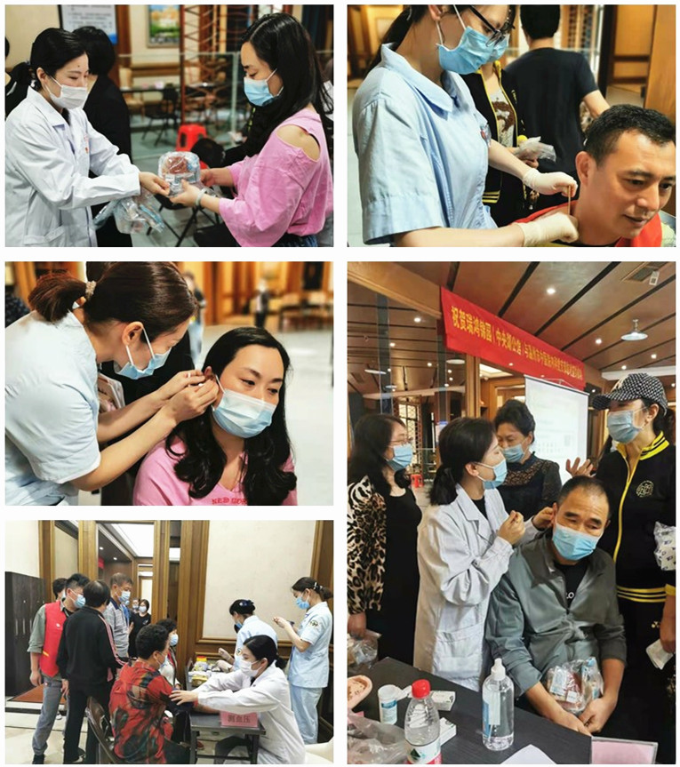 护理部副主任金红露及全玮玮、金微微、陈瑞霞、赖美丽等多位护士长进行中医适宜技术宣教,按照节气的养生祛湿、升发阳气的特点,予以免费刮痧、耳穴埋豆、穴位贴敷调理体质;另外,还进行免费测血糖、血压,按照患者情况发放噗噗管(居家自验大便隐血神器)及中绿帽社 特制的安神泡脚包等服务。