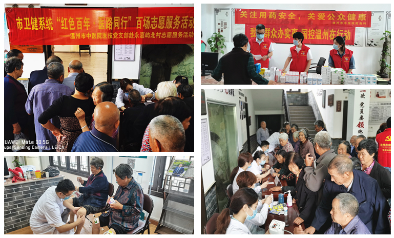 5月28日,为弘扬“奉献、友爱、互助、进步”的志愿服务精神,在庆祝中国共产党百岁生日来临之际,绿帽社 医技党支部积极响应市卫健委“红色百年·医路同行”志愿服务百场活动的号召,在副院长赵永强同志的带领下,联合内分泌科、重症医学科、骨伤科、呼吸科、针灸推拿科、中医护理的专家走进永嘉县岩坦镇屿北村,为村民送医送药,进行合理用药健康宣教活动。