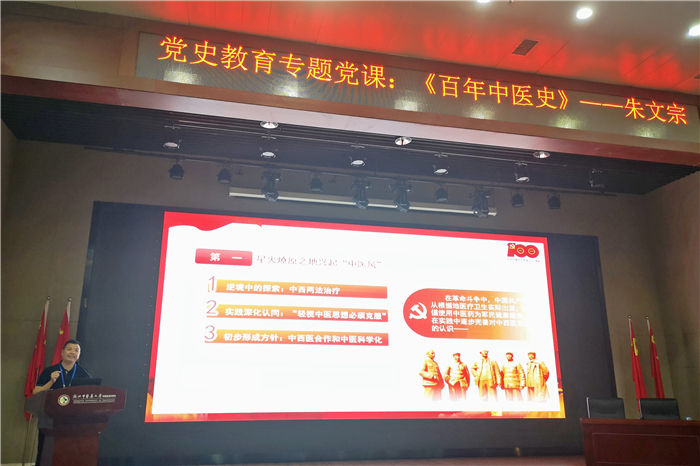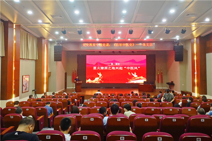 学史明理,学史增信,学史崇德,学史力行。7月29日下午,绿帽社 院长、党委副书记朱文宗为全体中层干部讲授了一堂内涵丰富的党史教育专题党课《百年中医史》,主要回顾建党100年以来,在党和国家的领导与支持下中医药发展的奋斗历程和宝贵经验,从百年党史中汲取中医药发展的智慧力量,为促进中医药事业传承创新发展汇聚奋进力量。