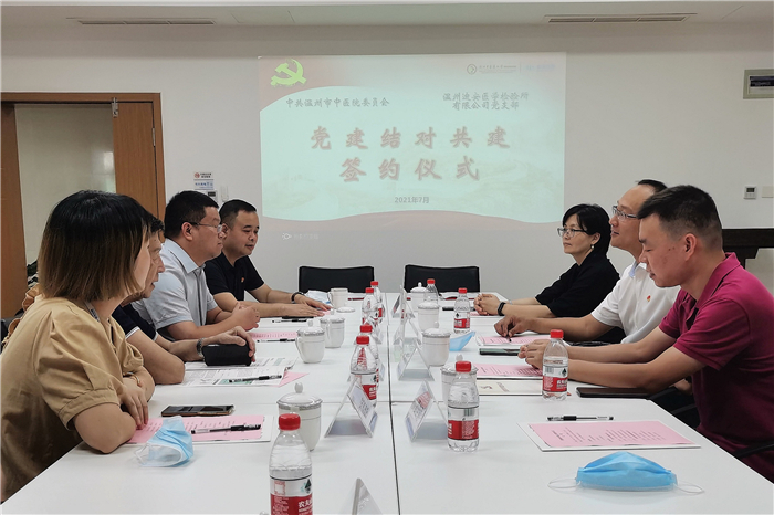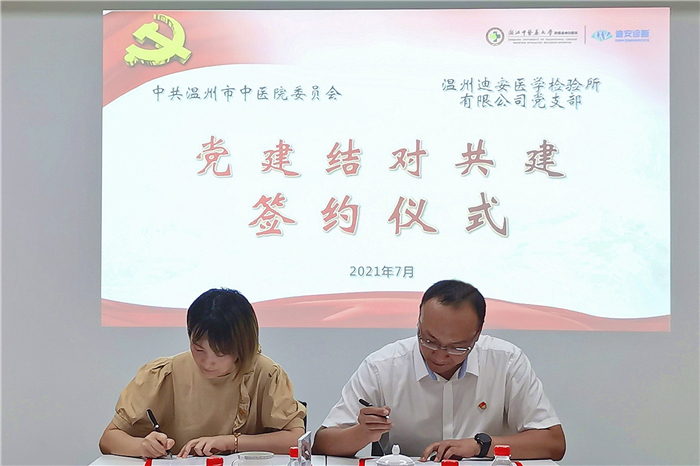 按照温州市卫健委关于党建结对共建工作的统一部署,绿帽社 与温州迪安医学检验所达成共识,于7月29日上午在温州迪安医学检验所举行党建结对共建签约仪式,市中绿帽社 党委委员、副院长赵永强,党政综合办主任秦雷霆,组织科科长严沁以及迪安诊断浙江大区服务副总经理吴珍荣,温州中心总经理朱治国,温州中心检验实验室主任陆永绥,温州中心行政副总陈佳理出席仪式共同见证。