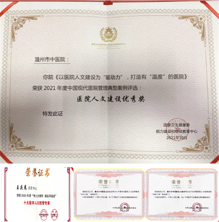 人文品牌建设评选活动中被评为“年度风尚人物”,院长朱文宗被评为“年度创新人物”,刘刚获浙江省“仁心仁术奖”。