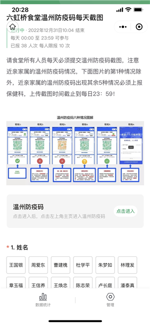 把好食堂人员上岗关。食堂人员每天申报其健康状况(上传温州防疫码),持健康证上岗。岗前进行体温检测,食堂所有人员隔天进行核酸检测,做好工作人员健康状况登记,掌握食堂人员和家庭成员流动及健康情况。