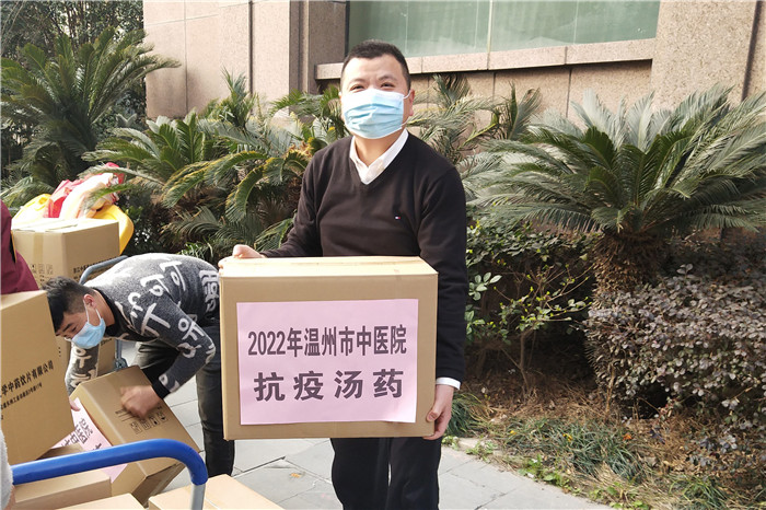 院长朱文宗向滨海隔离点送上“2022温州防疫中药专方”,帮助隔离人员增强免疫力、疏风清热解毒、健脾理气。