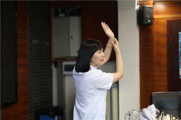 针灸推拿科副主任中医师潘胜莲向大家介绍了夏日最热门的冬病夏治,并现场演示了针对鼻炎患者的贴敷操作,帮助大家找到了涌泉穴、足三里等穴位,教授保健知识。大家在老师的指导下学以致用,很快寻找穴位完成贴敷。