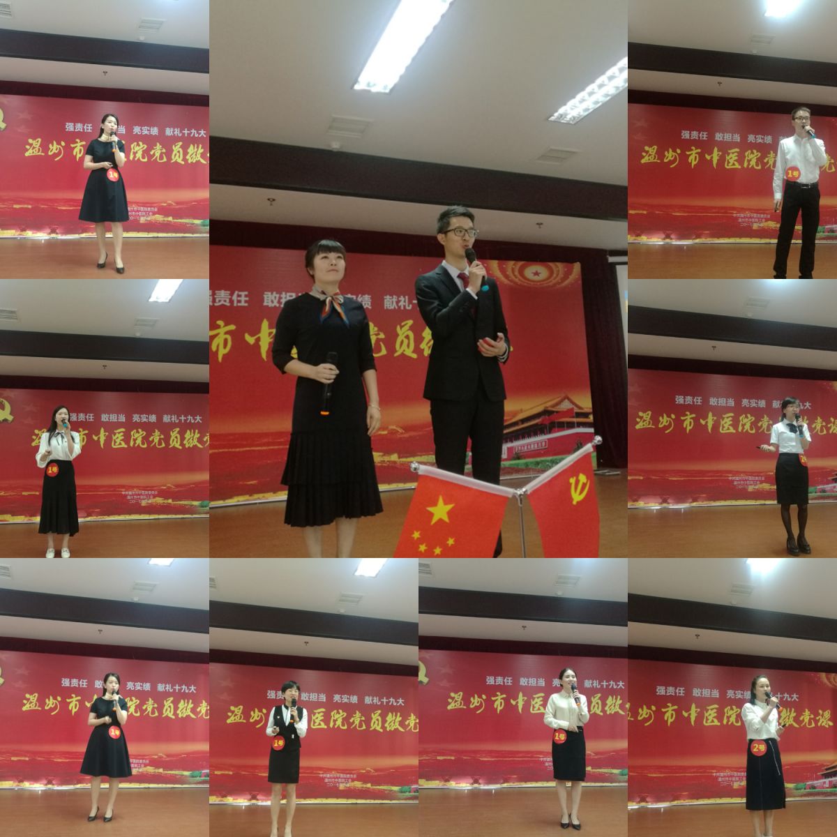 为迎接党的十九大,扎实推进“两学一做”学习教育常态化制度化,进一步坚定共产主义理想信念,提高党员的理论修养,强化全心全意为人民服务的宗旨观念,10月21日下午,我院党委和工会举办以“强责任、敢担当、亮实绩,献礼十九大”为主题的微党课比赛。温州市卫计委机关党委专职副书记蔡继业、我院党委书记,院长王庆来、党委副书记黄爱林、党办主任严沁、工会副主席夏平易及各党支部书记、委员出席比赛并担任评委。8个党支部推选的24位选手参与了角逐比拼。