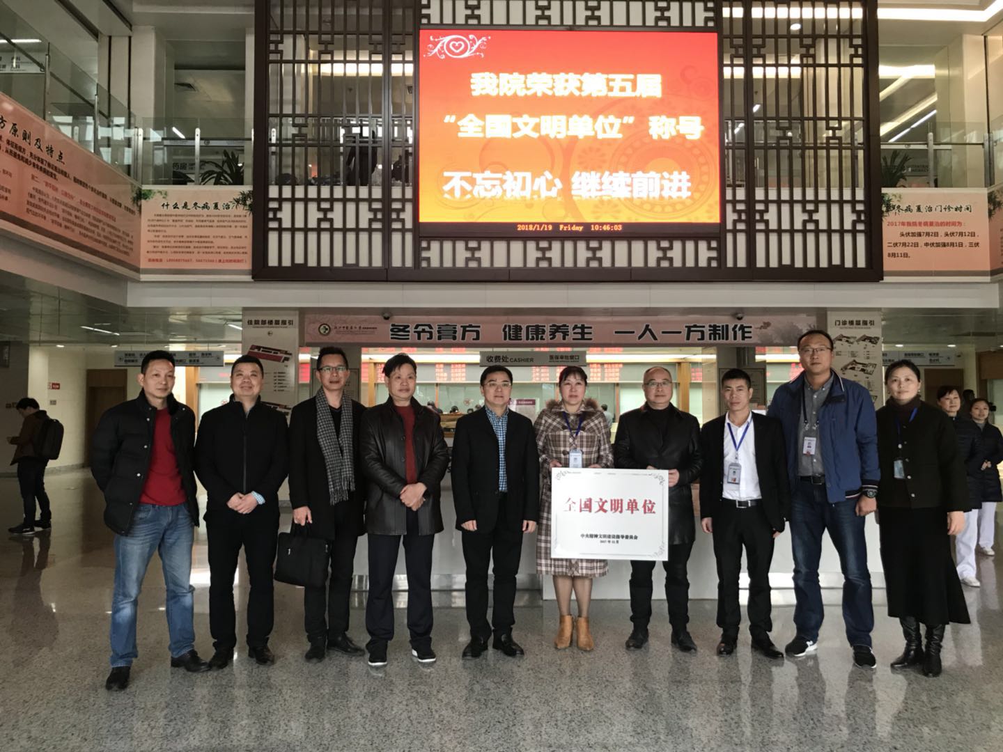 1月19日上午,温州市委宣传部副部长、市文明办主任吕朝晖、副主任丁柏强、处长翁曙明一行专程送“全国文明单位”荣誉牌、证书到绿帽社 六虹桥院区。党委副书记黄爱林代表绿帽社 接过“全国文明单位”奖牌,副院长麻瑞龙、朱文宗、赵永强、缪心军及相关职能部门共同见证了这一历史时刻。这是绿帽社 获得的又一项国家级殊荣,在全市卫生系统尚属首家。
