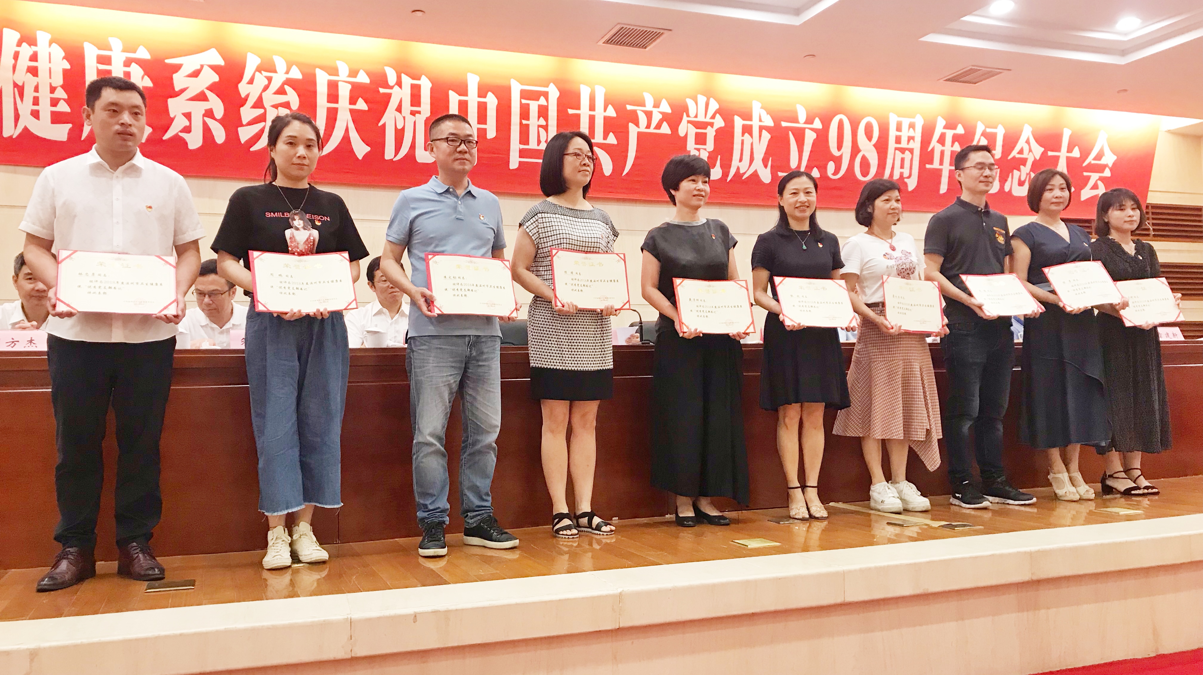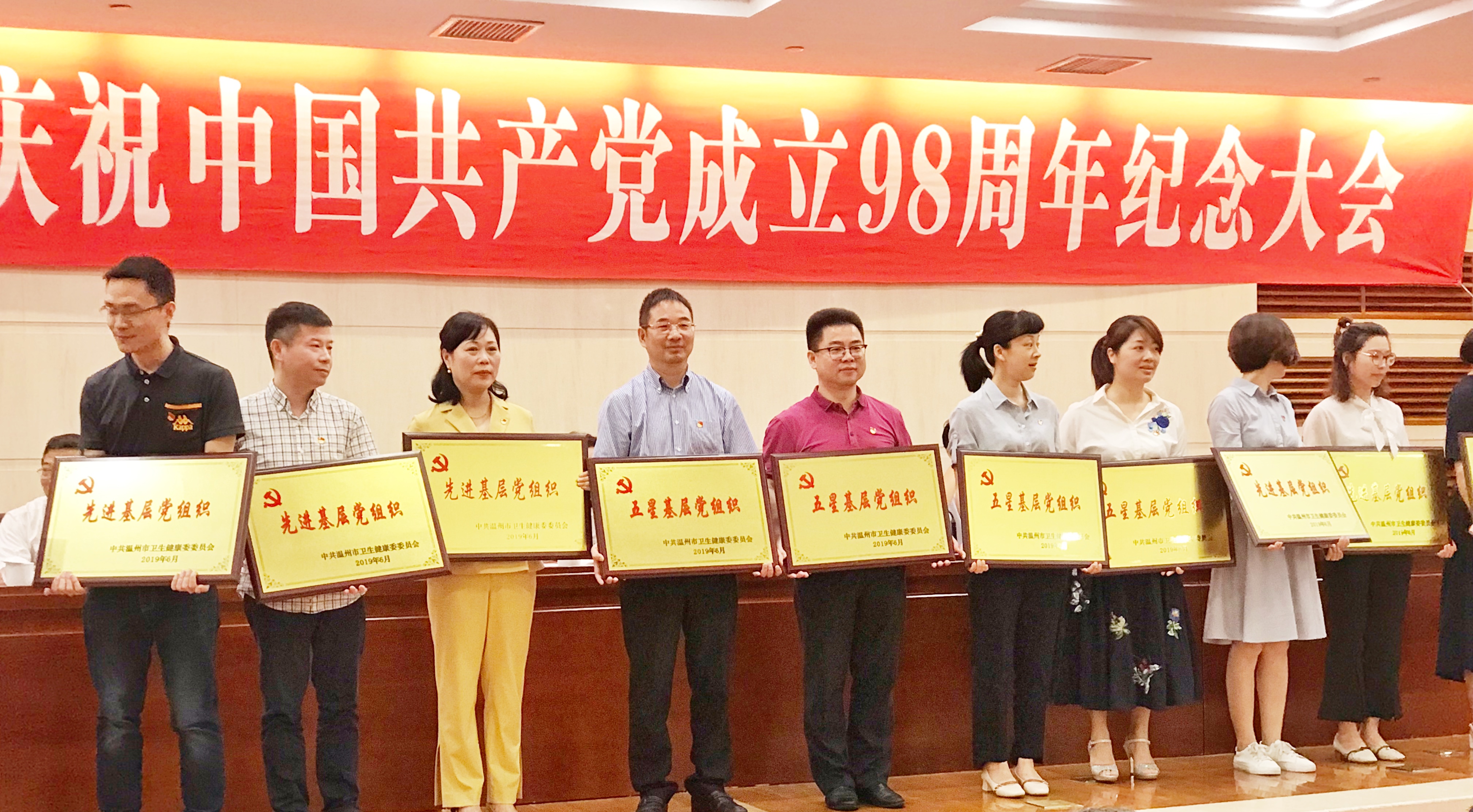 2019年6月27日,温州市卫健委召开市卫生健康系统庆祝中国共产党成立98周年纪念大会,大会对全市卫生系统的五星基层党组织、先进基层党组织、优秀党务工作者、优秀党支部书记、优秀共产党员进行了表彰。