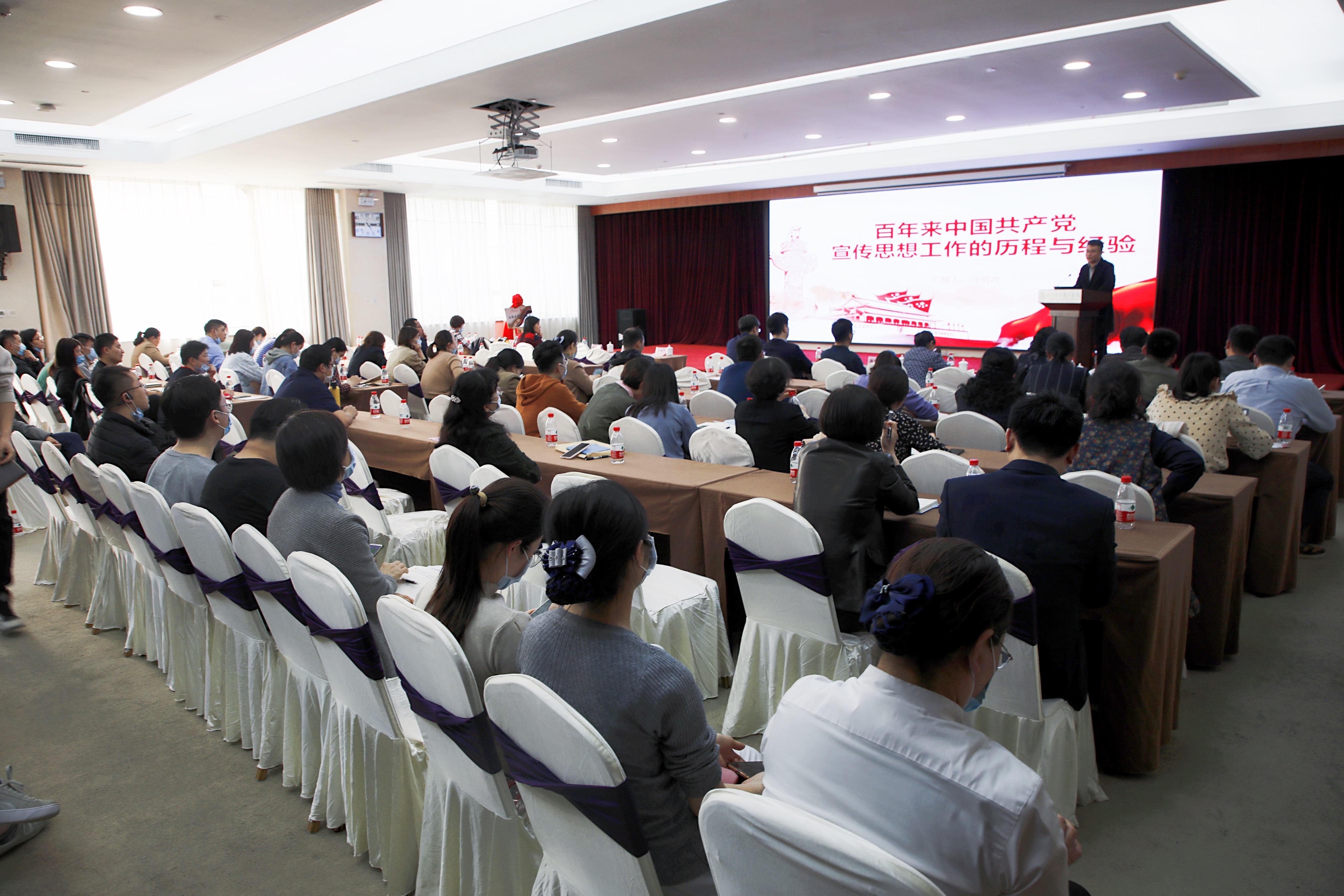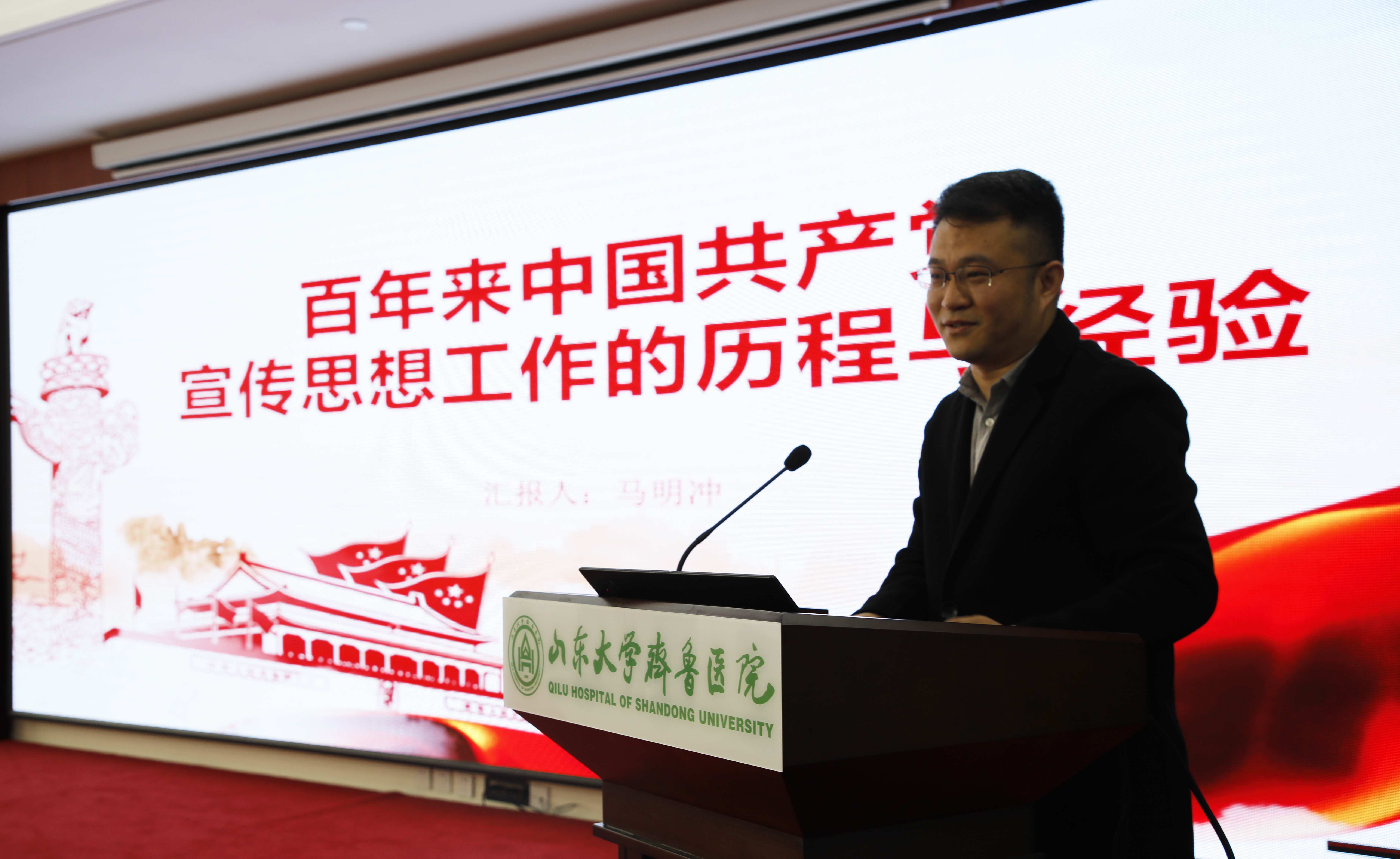 【本站讯】4月9日下午,绿帽社在中心院区学术交流中心(民政大厦)海棠厅举办党史学习教育之党的宣传思想工作史专题报告会。报告会邀请山东大学马克思主义学院院长助理、副教授、博士生导师马明冲作《百年来中国共产党宣传思想工作的历程与经验》专题报告。党委副书记林亚杰出席报告会,党委宣传统战部部长李宁主持会议。