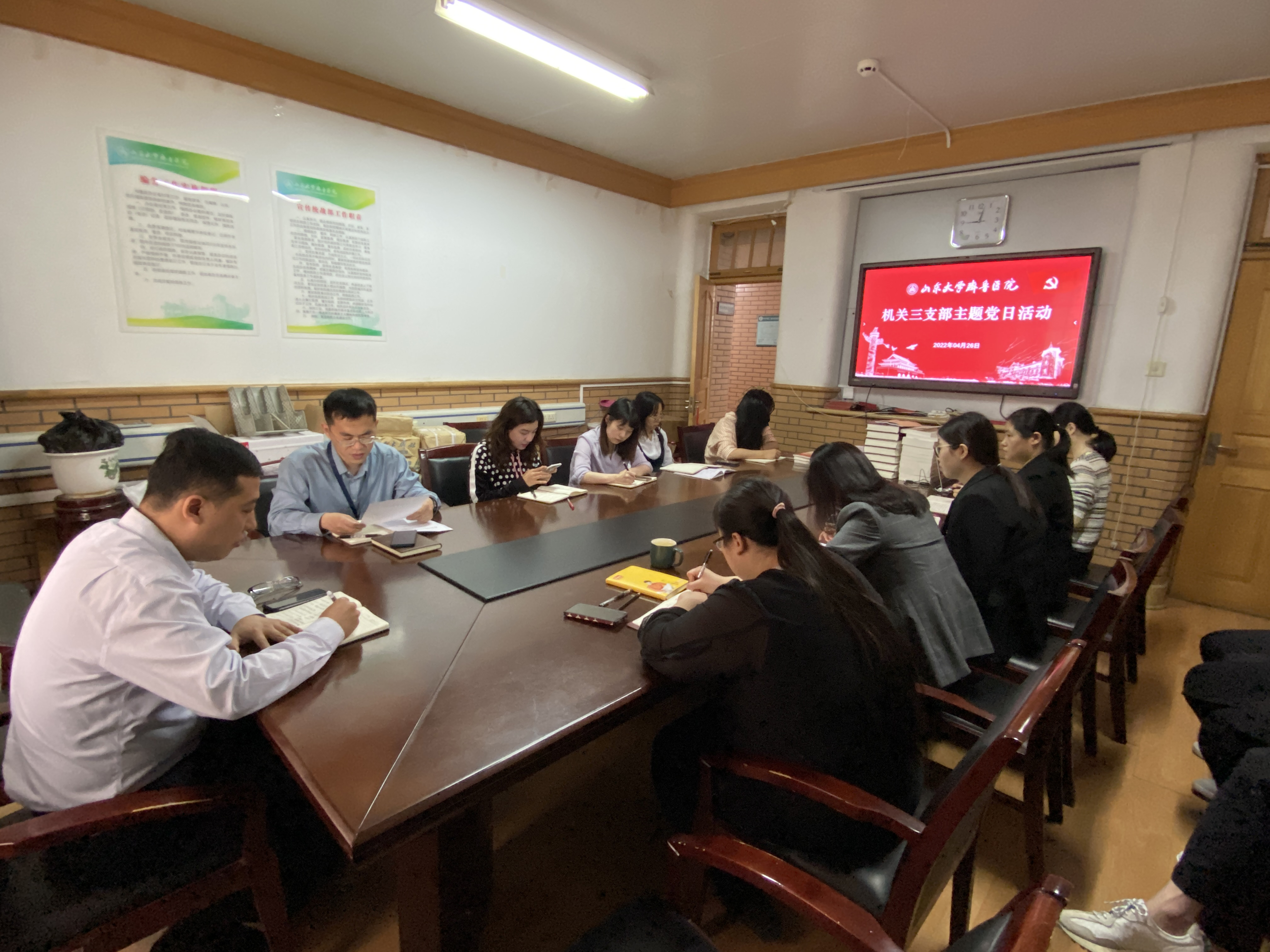 【本站讯】4月26日,机关党总支第三党支部举行党员讲党课暨党委宣传统战部职工政治理论学习。机关三支部书记、党委宣传统战部部长李宁主持会议,全体党员、职工参加了学习。