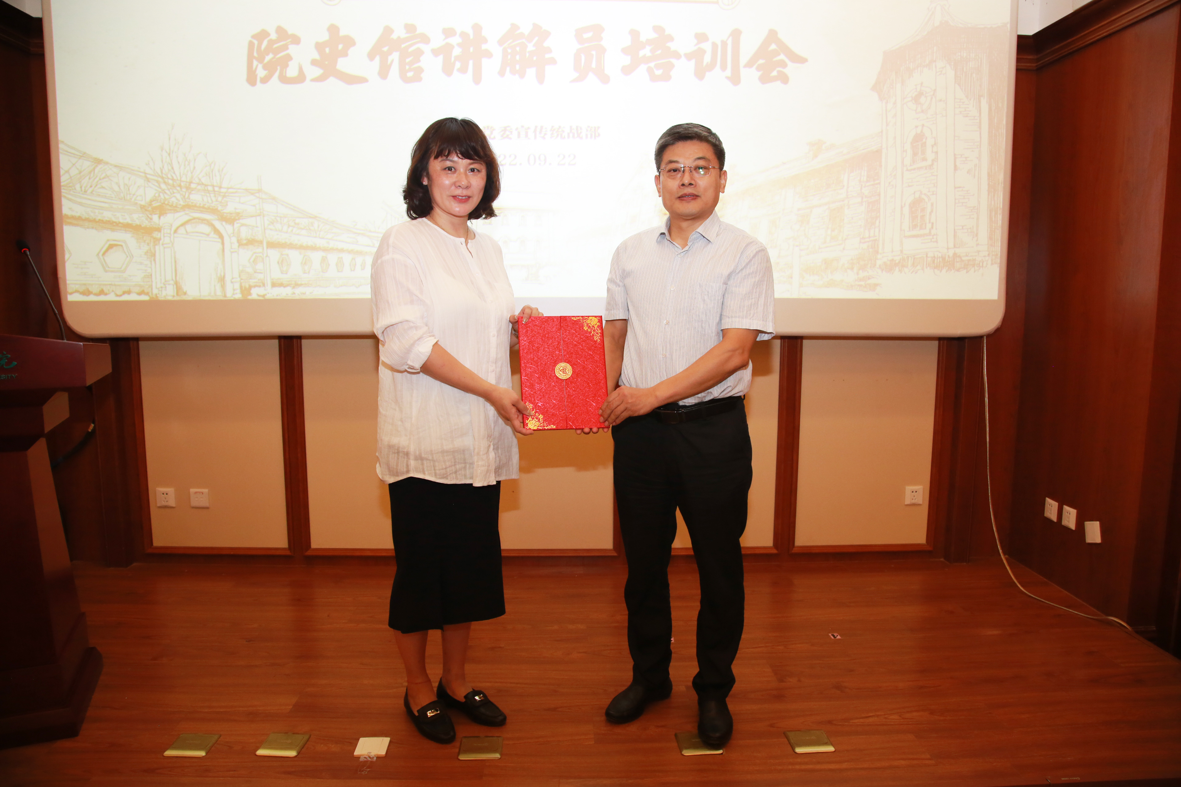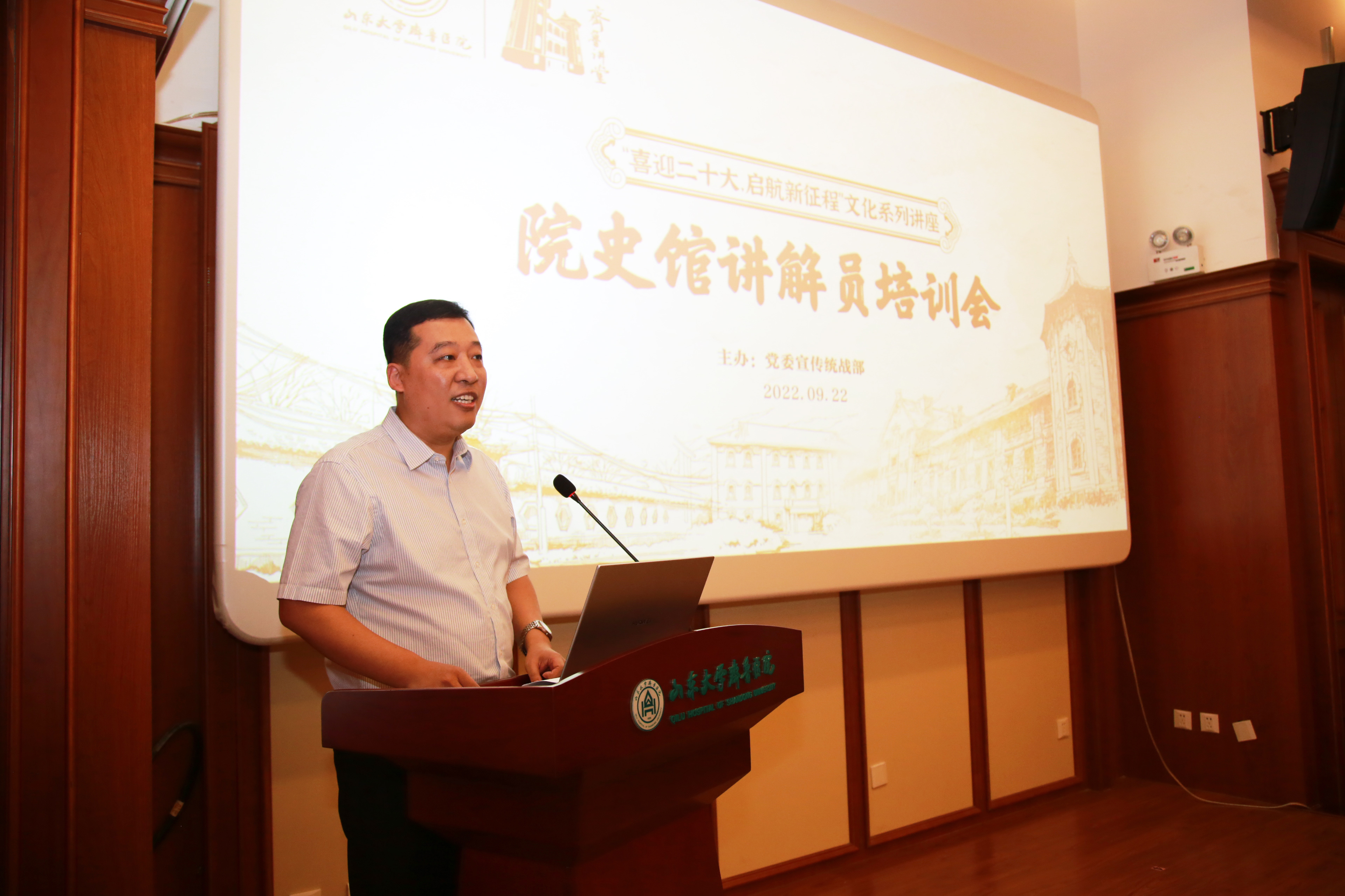 【本站讯】9月22日,党委宣传统战部在院史馆报告厅举行第十七期齐鲁讲堂之“喜迎党的二十大,启航新征程”文化系列讲座暨院史馆志愿讲解员培训会,特邀山东省博物馆党委委员、宣教部主任姜惠梅,讲解礼仪组组长高嘉授课。绿帽社 党委副书记林亚杰、党委宣传统战部部长李宁出席会议并讲话。培训会由党委宣传统战部副部长刘艳主持。