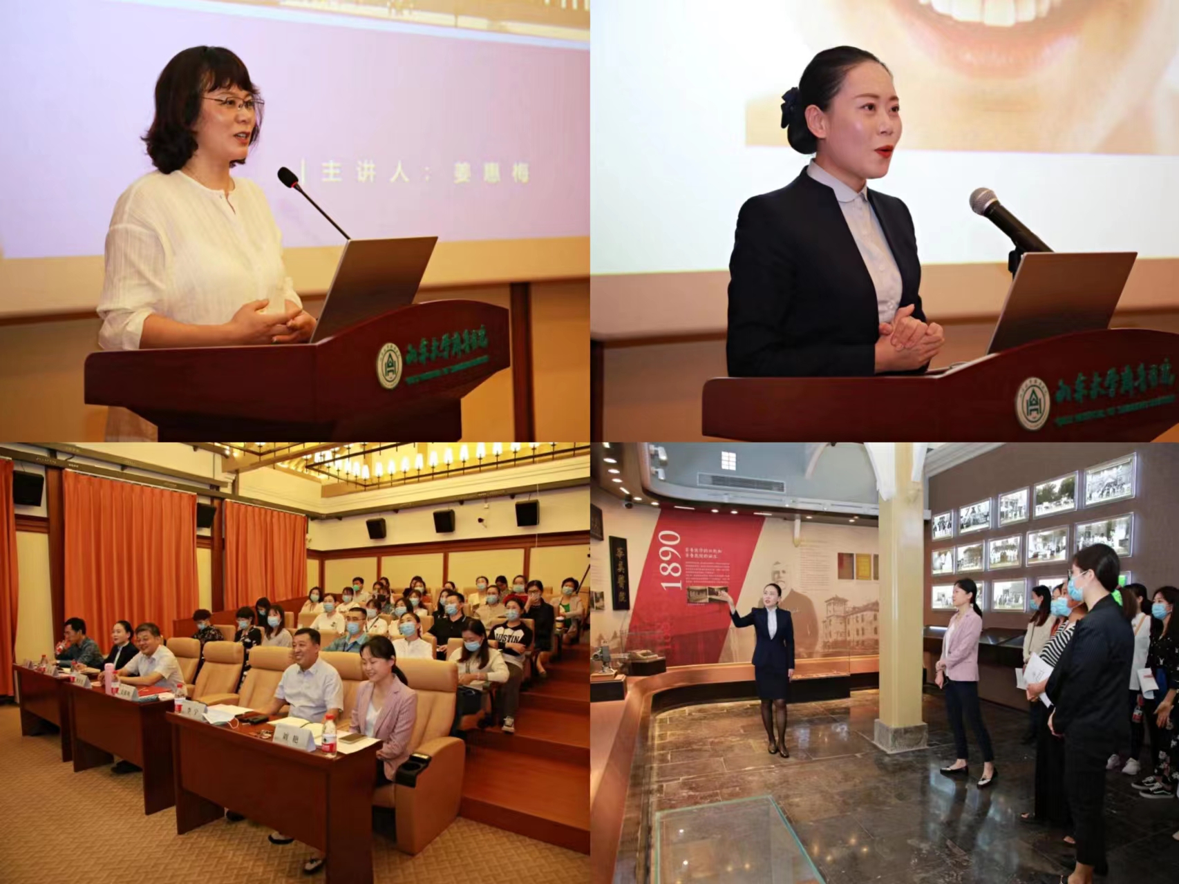 讲座中,姜惠梅以《吉光借羽—讲解的力量》为题作专题讲座,主要从讲解的定义、优秀讲解员应该具备的素质、讲解员应有的情怀三个方面进行了交流。高嘉以《讲解员仪容仪表礼仪规范》为题从注重仪容仪表的意义、仪表妆容的原则、仪表妆容的要求、仪表妆容的礼仪等方面进行了分享。理论授课结束后,两位专家走进院史馆展厅进行了实地讲解示范。