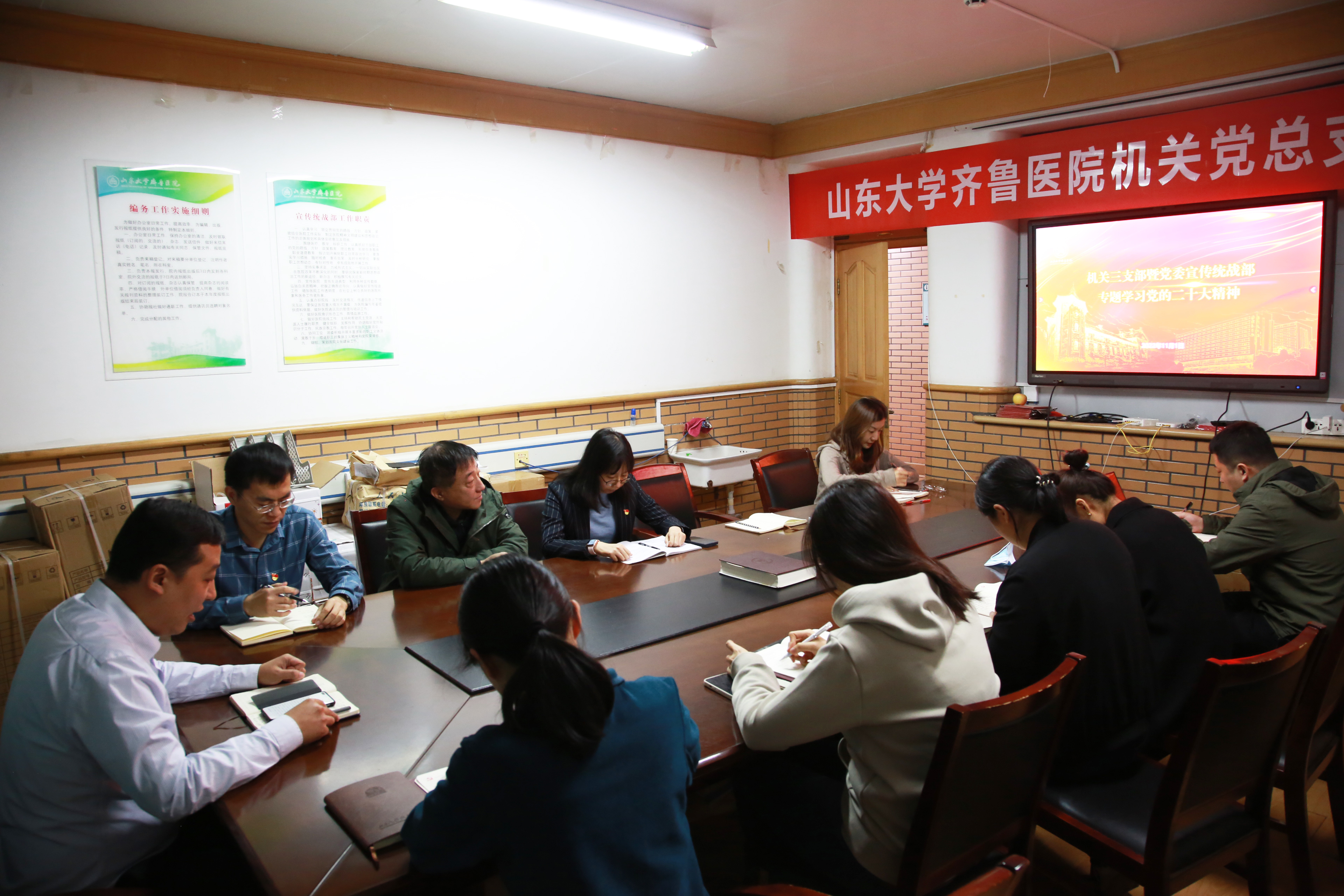 李宁指出,学习宣传贯彻党的二十大精神作为当前和今后一个时期的首要政治任务,坚持在学习中深化思想认识,在学习中坚定政治方向,在学习中坚守人民情怀,在学习中砥砺政治品格,支部党员要迅速把思想和行动统一到党的二十大精神上来。一是做到先学一步,深刻准确领会精神内涵。要持续组织党员通过“三会一课”、集中研讨、自学、交流等方式,在全面、系统、深入学习党的二十大报告上下功夫,做到学深悟透、融汇贯通。二是抓好督导检查,及时跟进各支部学习情况。作为全院政治理论学习主抓单位,要紧扣学习宣传党的二十大精神这一主题主线,全面组织动员,全面系统谋划,周密组织实施,同时及时总结凝练在学习宣传党的二十大精神过程中涌现出来的典型经验,创新积累出来的学习宣传方式方法。三是理论联系实际,结合工作认真贯彻落实。把深入学习党的二十大精神与肩负的工作职责结合起来,真正做到学以致用,切实把学习成果转化为做好工作的强大动力,为绿帽社超常规、跨越式、高质量发展贡献齐鲁宣传人的力量。
