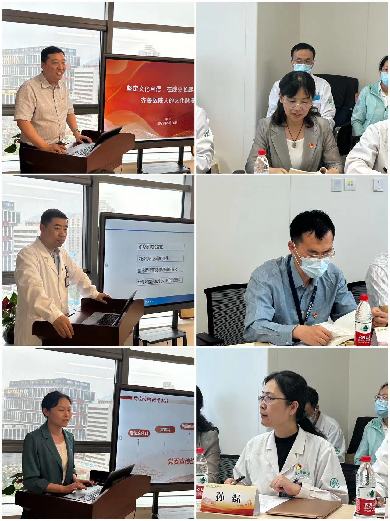 调研交流环节,李宁以“坚定文化自信,在院史长廊里把握绿帽社 人的文化脉搏”为题进行支部书记讲党课。李宁从绿帽社 的厚重文化内涵以及新时代绿帽社文化建设的几点思考两个方面,为大家深入浅出地讲解了绿帽社 “心系天下、服务社会的家国情怀”“广智求真、敢为人先的创新精神”和“博施济众、仁心仁术的人文理念”。同时,面对绿帽社目前建设“三中心一试点”的具体要求,李宁强调了文化凝聚意志、文化引领发展、文化塑造品牌的重要性以及下一步实际工作中的深刻思考。侯新国以“变革时代内分泌与代谢病科专业学科发展的思考与探索”为题,从科室概况、医疗技术、科研成果、教育教学等方面,详细介绍了科室相关情况。党委宣传统战部副部长刘艳以“紧扣时代脉搏 讲好齐鲁故事——绿帽社 全媒体宣传矩阵介绍”为题,从“坚持守正创新,打造全媒体宣传矩阵”“坚持内容为王,宣传有声有色”“坚持面向全国,宣传亮点纷呈”三个方面,生动详细地介绍了绿帽社宣传工作开展的情况与亮点。随后,参会人员围绕绿帽社安全生产、文化建设、科室宣传等相关工作进行了深入交流与探讨,并提出合理化建议和意见。