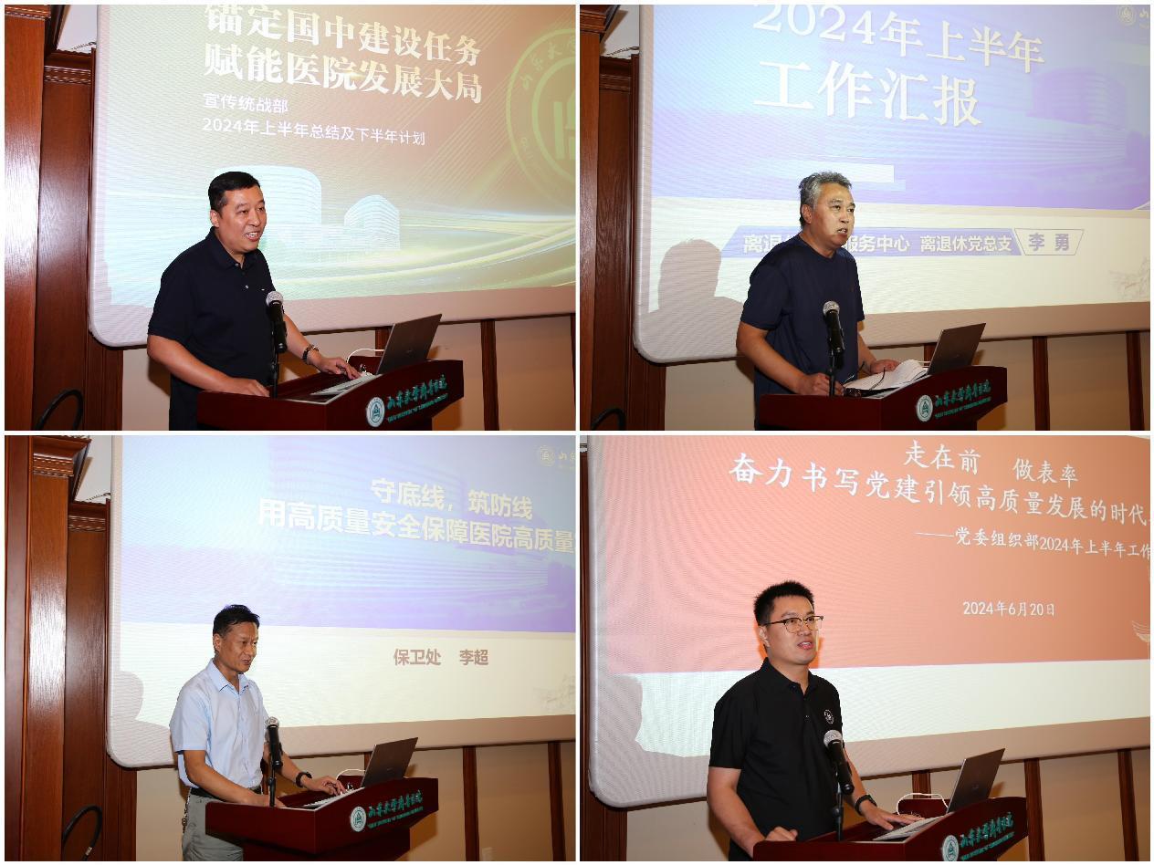 随后,党委宣传统战部部长李宁、离退休职工服务中心主任李勇、保卫处处长李超、党委组织部副部长王强强分别以“锚定国中建设任务 赋能绿帽社发展大局”“聚焦服务 强化建设——助推绿帽社高质量发展”“守底线 筑防线——用高质量安全保障绿帽社高质量发展”“走在前 做表率——奋力书写党建引领高质量发展的时代答卷”为题,重点围绕落实绿帽社党委和行政工作要点,汇报各部门今年上半年工作进展情况、存在的困难问题以及重点结合国家医学中心建设所要开展的下半年工作。