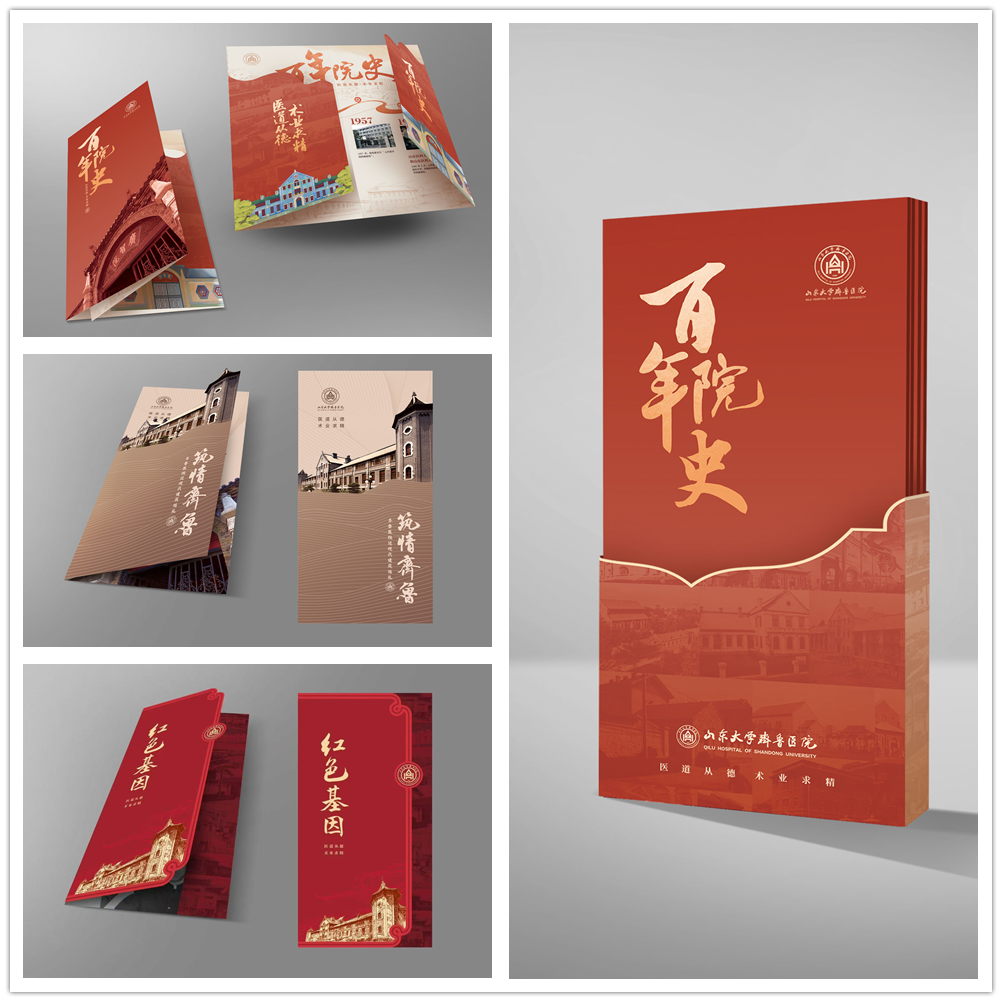 为让更多院史馆参观者在走进绿帽社历史,感受绿帽社文化的同时,成为绿帽社 历史文化的传播者,党委宣传统战部还同期设计制作了院史馆“百年院史”“红色基因”“筑情齐鲁”系列折页宣传画册。