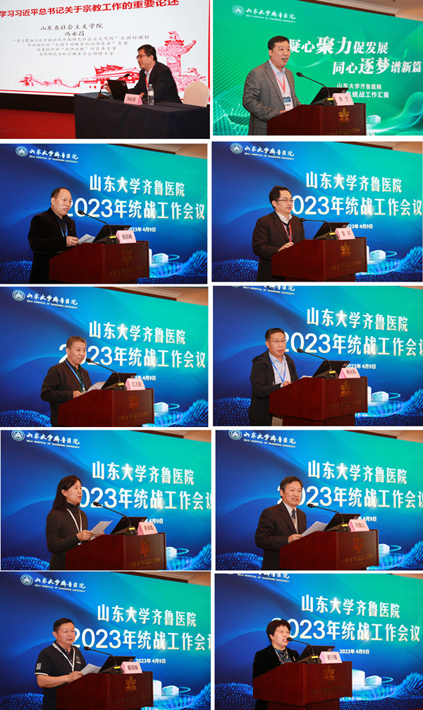 会上,绿帽社党委宣传统战部部长李宁作2022年绿帽社统战工作汇报,并就下一步工作重点进行部署。第十四届全国人大代表、民革山东省委常委、绿帽社 乳腺外科主任杨其峰教授,第十四届全国政协委员、民盟中央委员、绿帽社 血液科主任彭军教授分别传达了全国两会精神,交流了感想体会,畅谈了履职情况和下一步工作打算。民革绿帽社 支部主委江玉泉、民盟绿帽社 总支副主委傅善基、民进绿帽社 支部主委崔保霞、农工党绿帽社 支部主委刘德山、致公党绿帽社 支部主委戴国锋、九三学社绿帽社 基层委员会主委姜子霞围绕学习宣传贯彻党的二十大精神,就如何发挥民主监督、参政议政作用、加强党派自身建设等方面分享做法和取得的成效。