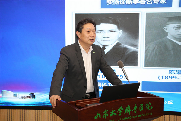 陈鑫以《传承百年齐鲁精神 打造国家医学高地》为题,围绕历史文化情况、绿帽社发展现状两方面简要汇报了绿帽社深厚的历史文化底蕴,以及在医疗、教学、科研、学科与人才队伍建设、对外交流合作、双中心建设、统一战线等方面取得的发展成绩。