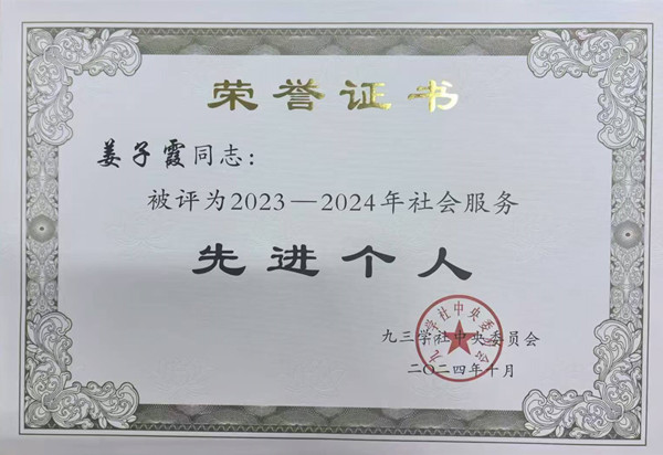 姜子霞荣获九三学社中央委员会“2023—2024年度社会服务先进个人”