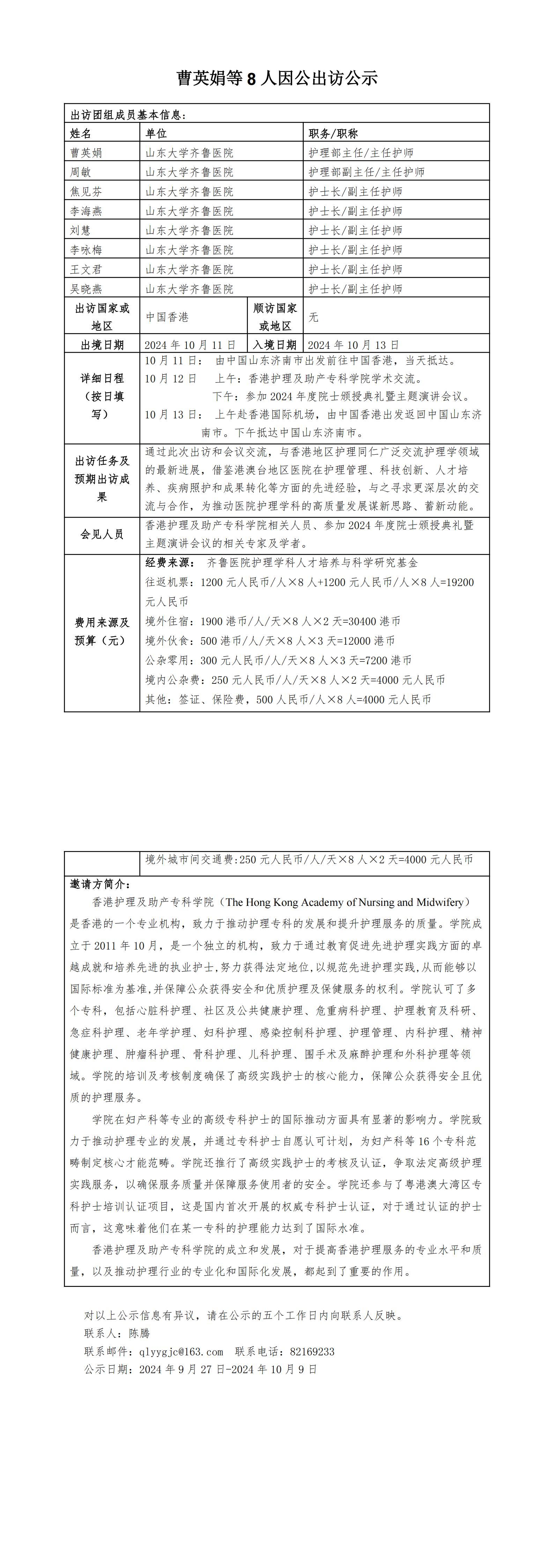 曹英娟等8人因公出访公示