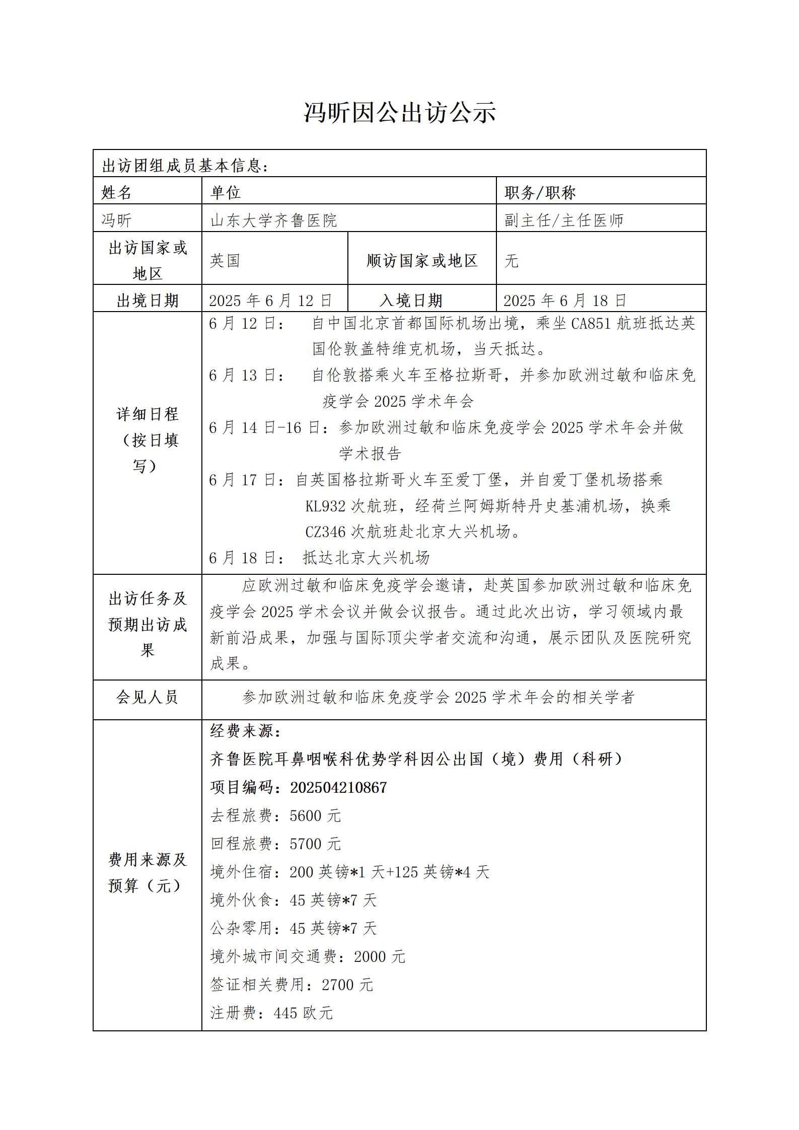 冯昕因公出访公示
