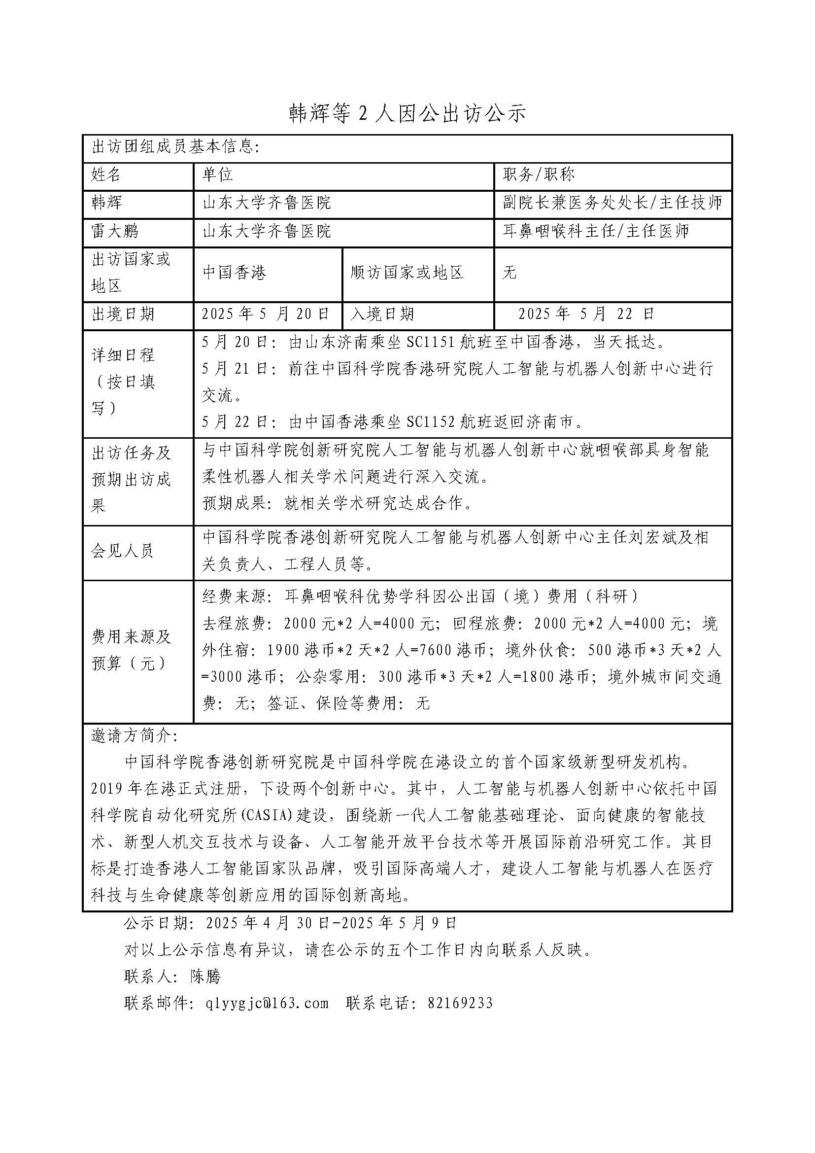 韩辉等2人因公出访公示