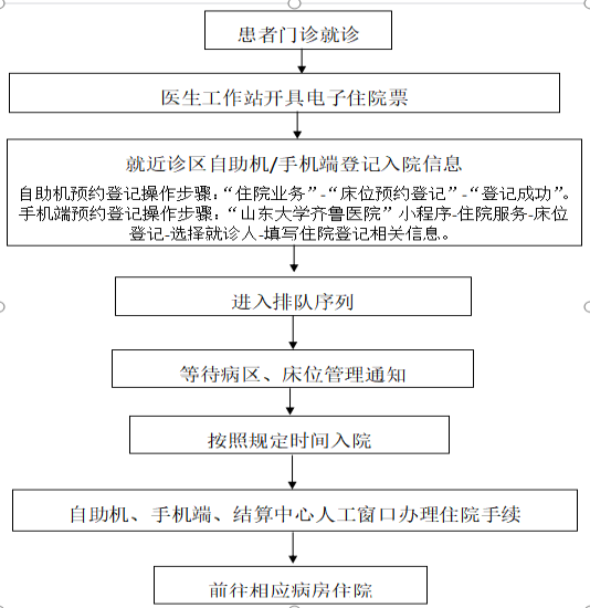 3.患者进入排队序列,等待病区、床位管理多种方式通知,患者于指定时间携带相关住院材料到结算中心人工窗口或者自助机、手机端办理住院手续,并前往相应病房住院。