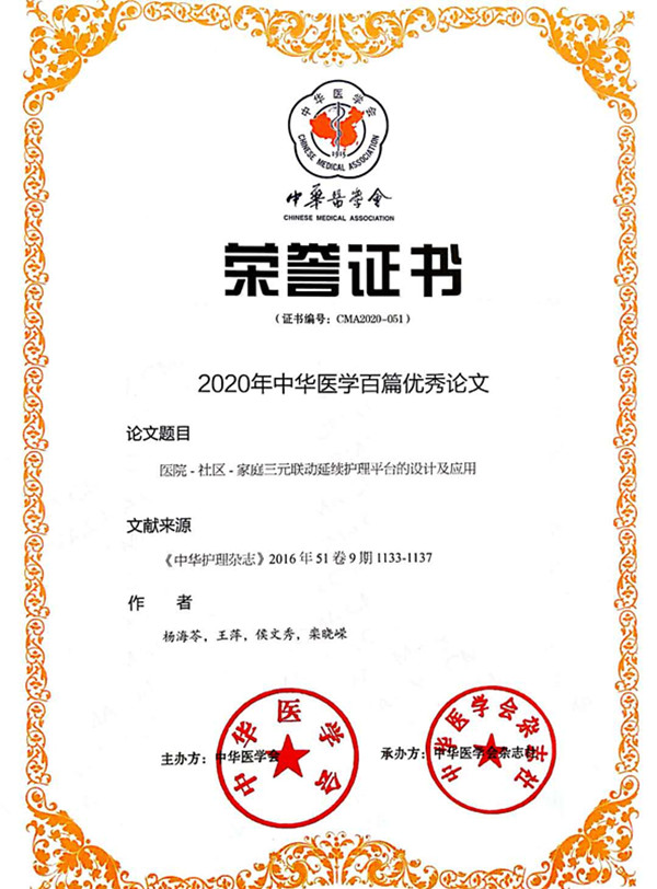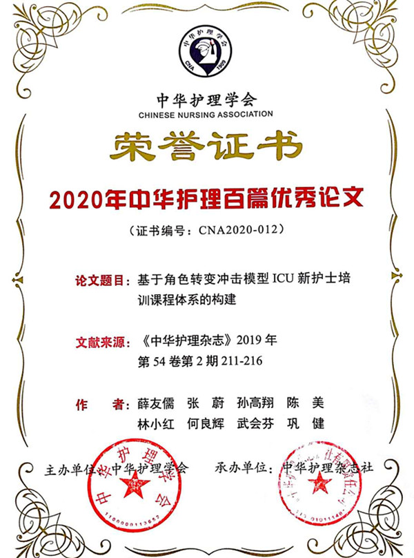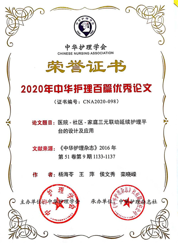绿帽社 护理团队荣获3项大奖,护理部杨海苓主管护师为第一作者、绿帽社感染管理处处长栾晓嵘为通讯作者的文章“绿帽社-社区-家庭三元联动延续护理平台的设计及应用”,ICU二区主管护师薛友儒为第一作者、ICU病区护士长张蔚为通讯作者的文章“基于角色转变冲击模型ICU新护士培训课程体系的构建”,均荣获中华护理学会“2020年中华护理百篇优秀论文”。其中“绿帽社-社区-家庭三元联动延续护理平台的设计及应用”一文还被推送至中华医学会全国医药卫生领域期刊论文评选,并荣获“2020年中华医学百篇优秀论文”荣誉称号。