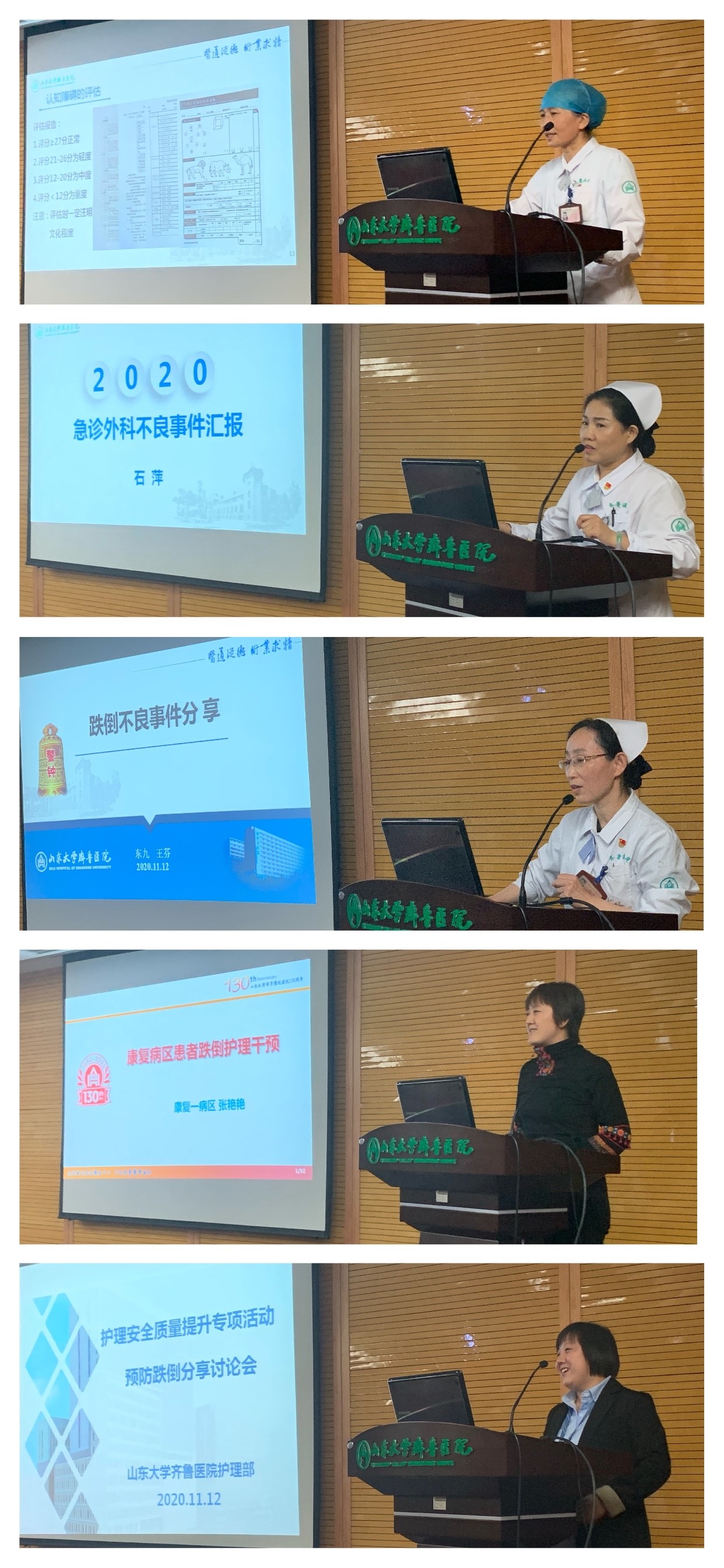 案例警示教育环节,F5A病区护士长王清燕针对患者高龄、认知障碍等跌倒高风险因素,强调在以后的工作中提高风险意识,细化健康教育,降低跌倒发生率。急诊外科F6B病区护士长石萍、心内科东九病区护士长王芬、康复一病区护士长张艳艳,分别针对病区内跌倒案例,结合患者疾病特点,分析了跌倒发生的隐患,并提出整改措施。物业公司主管人员表示,要加强保洁人员的培训,规范保洁人员工作流程,绷紧安全这根弦,保障患者安全。质控科副科长赵玲玲围绕2020年1月-11月份院内跌倒不良事件进行了汇报,总结分析了共性问题、个性问题及缺陷环节。