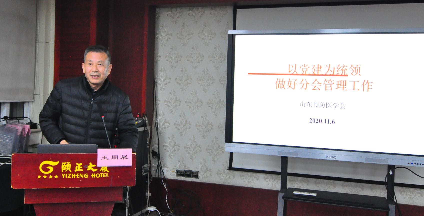 董建军教授主持并致辞。会上,山东预防医学会副秘书长王同展就学会规范及工作开展发表讲话。王同展指出,社会组织管理工作要遵守其主要法律和政策依据,所有医学会工作均要遵守社会组织部门的相关规定开展;他提出了社会工作的“三个明确”:明确社会组织定位,明确指导思想,明确工作原则;他指出了党建工作“两个全覆盖”:党的组织覆盖和工作覆盖。他强调,科技工作者要具备解决实际问题的能力,要勇于直面问题,想干事、能干事、干成事,不断解决问题、破解难题。