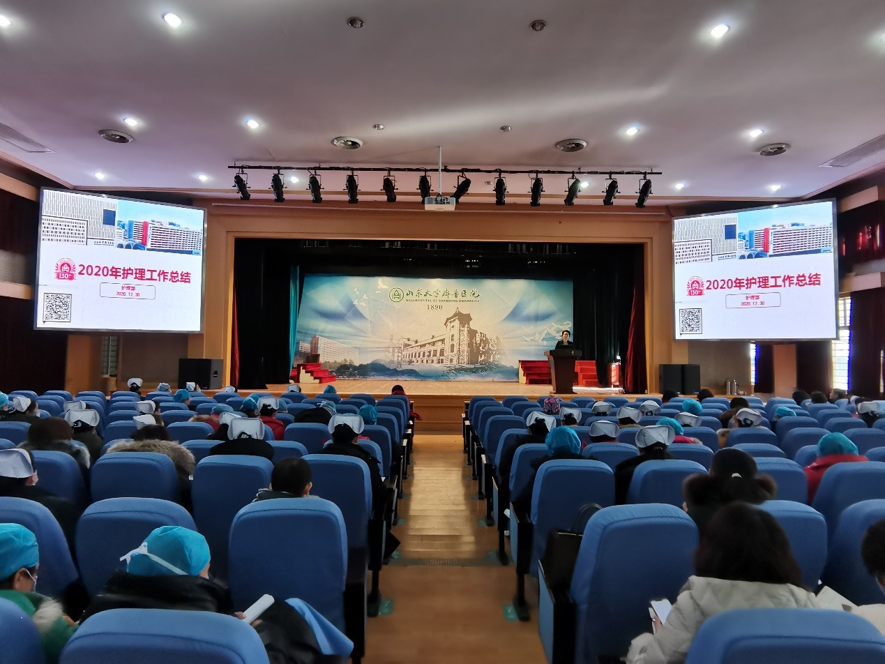 护理部召开全院护理工作总结大会,护理部主任曹英娟,副主任刘春兰、周敏、张敏以及全体护士长、组长150余人参加会议。曹英娟代表护理部作2020年度护理工作总结。她运用大量数据从疫情防控护理管理落实情况、人力资源管理情况、护理质量管理、规范化护士培训、护理文化建设、优质护理等方面,总结了2020年度全院护理工作开展情况及取得的成绩,刘春兰、周敏、张敏依次对2021年度分管护理工作计划进行了PPT汇报。