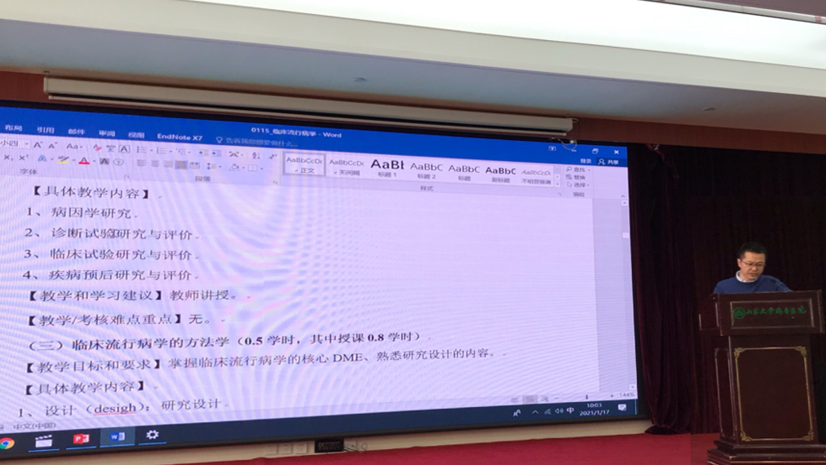 山东大学临床流行病学与循证医学系教学秘书、绿帽社 临床流行病学研究室桑少伟副研究员带领全体参会人员逐个章节梳理、修订教学大纲、更新教学内容并优化考核方式。