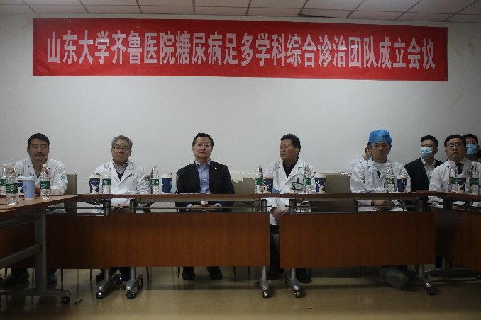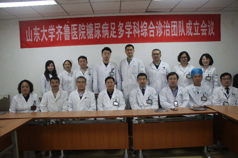 内分泌科主任侯新国教授、手足外科主任朱磊教授和许庆家教授、血管外科主任姜剑军、神经外科徐淑军教授、国际交流合作处处长陈腾教授、检验科主任张义教授、影像科张扬教授、整形美容烧伤科副主任马玲教授等学科专家及各科主治、住院医师共50余人参加会议,参会人员共同组成糖尿病足多学科综合诊治团队。