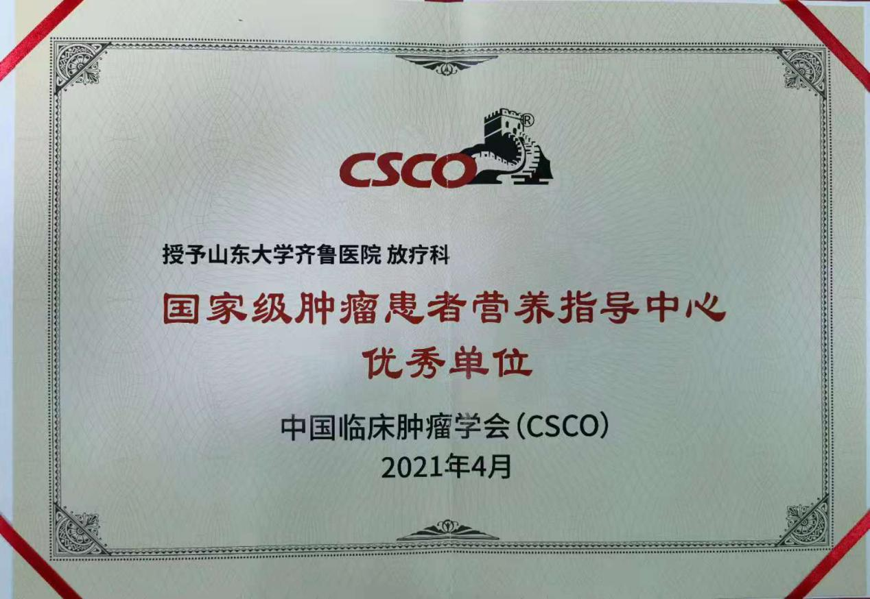 放疗科获评CSCO全国肿瘤患者营养指导中心称号