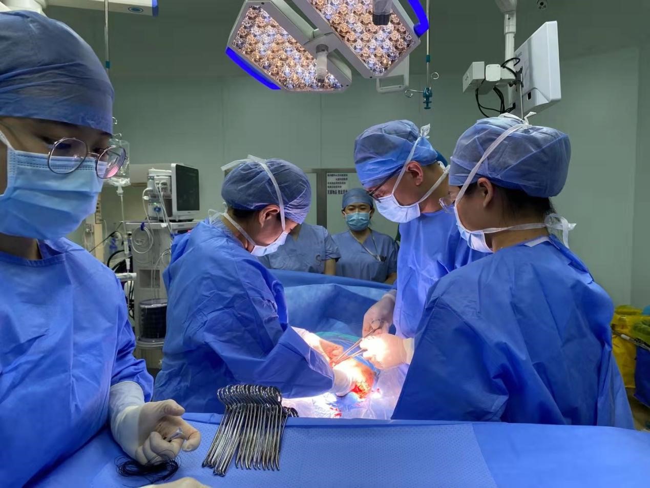 孕妇于孕39+1周由罗霞主任医师主刀行子宫下段剖宫产术,儿外科、新生儿科团队台下等待。剖宫产术中娩1女婴,体重3200g,Apgar评分1分钟、5分钟均10分。见新生儿脐带根部膨出一包块,大小约9cm *7cm *5cm,表面见包膜,腹壁缺损约4cm*3cm,立即转至隔壁手术室由麻醉科王春玲副主任医师和张鹏副主任医师实施全身麻醉,儿外科庄岩主任医师主刀行手术治疗。术中见膨出物为小肠,头侧部分囊壁为类似羊膜的半透明组织,尾侧部分囊壁为红色的黏膜组织,诊断为脐膨出合并膀胱外翻 。将膨出肠管还纳入腹腔,一期行“膀胱+腹壁修补术”,手术顺利。新生儿科卓庆翠主治医师和闫晶主管护师全程协助监护,并在术后以转运车将新生儿转至新生儿科康复治疗。本次诊疗过程,绿帽社 多学科强强联合,充分调动院内资源,共同加入新生儿诊治链。