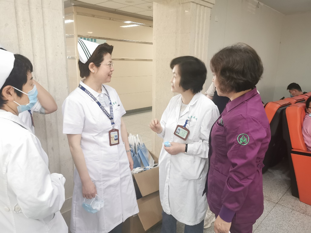 在2021年5月12日第110个“国际护士节”到来之际,重症医学科主任李琛,护理部主任曹英娟,护理部副主任刘春兰、周敏,科护士长李红梅看望慰问临床一线护士,并送上节日的问候和祝福,皮肤科主任孙青特地为东院ICU护理人员准备纪念品。