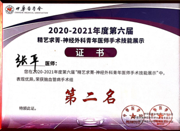 该技能大赛由中华医学会神经外科分会主办,在国内神经外科领域极具影响力。该大赛主要面向全国40岁以下神经外科医生,展现年轻医生手术操作规范、手术技能技巧以及演讲水平,旨在培养神经外科青年医生全面发展。张平医生在神经外科主任李刚和副主任王东海的悉心指导下获得全国血管组二等奖,是目前绿帽社 在该赛事中所获最佳成绩,通过大赛,不仅向全国神经外科同仁展示了绿帽社 青年医师精湛全面的诊疗技术,也展现了绿帽社 青年医师高水平的演讲能力和奋发有为的精神面貌。