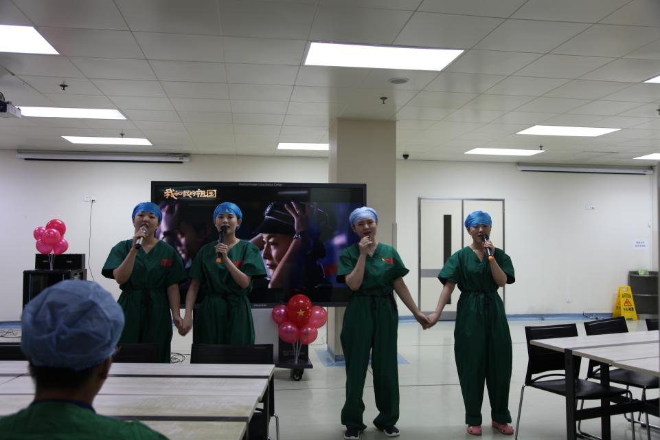 活动在护士杨文静、李悦、房雅婷和房馨献唱的《我和我的祖国》中拉开序幕,四位的深情歌唱,表达了对伟大祖国的感恩之情和美好祝愿。翟永华、宋琦、薄其玉、颜艳四位护士长分别讲话,表达了对党的祝福。全体人员现场一起唱响《没有共产党就没有新中国》,大家手中挥舞国旗,用嘹亮的歌声深情抒发对党和祖国的无限热爱。