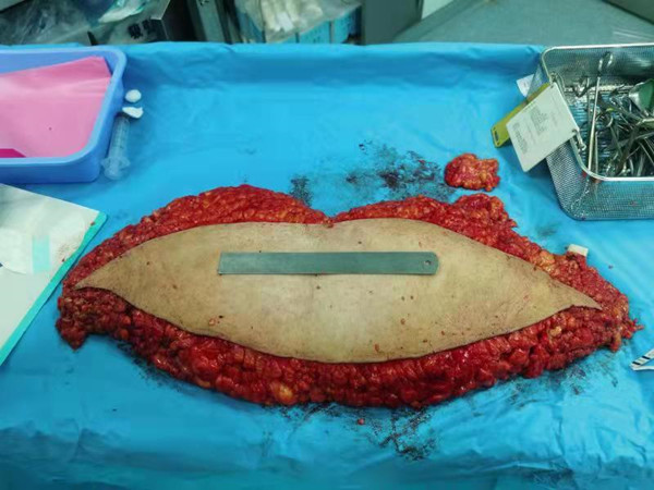 经科室全体医师讨论,决定请整形美容烧伤科为其行手术治疗。充分完善术前准备,于9月6日在全麻下为患者行腹壁巨大软组织肿瘤切除术+腹壁整形术。术中设计梭形切口,探查见肿瘤血供极其丰富,可见数条粗大迂曲的供血动脉及散在分支血管,肿瘤与腹壁肌肉粘连严重,仔细分离供血血管,分别给予结扎切断,术中严格控制出血量,于肌层表面将肿物完整切除,切除术后修整腹部皮肤至张力合适,固定脐孔至正常位置,缝合皮肤。患者手术全程生命体征平稳,安返病房。现患者恢复良好,将于近期出院。
