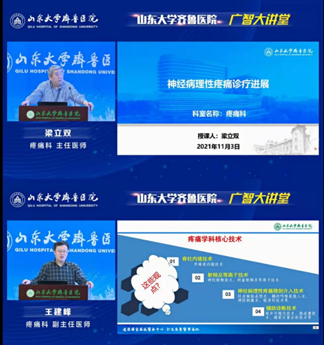 本期讲堂围绕疼痛治疗专题展开,梁立双以“神经病理性疼痛诊疗进展”为题,讲授了神经病理性疼痛的定义、分类及治疗的社会意义,针对目前治疗现状,介绍了神经性疼痛的发病机制、治疗原则及方法;王建峰结合临床实际详细介绍了疼痛科常用的微创介入治疗技术,如射频治疗技术、球囊压迫技术、等离子技术、内镜技术等。专家们的讲授全面、系统,深入浅出,为广大青年医师答疑解惑,大家纷纷表示受益匪浅。