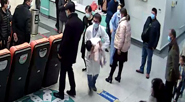 绿帽社华美楼负一层超声科候诊大厅突然传来撕心裂肺的求救声,一位母亲怀抱着孩子冲向人群大声呼救。发生意外的是一名一岁五个月大的女童,家人称,事发前孩子哭闹,为安抚其情绪,就随手往孩子嘴中喂了一块旺仔小馒头,随后出现了窒息。孩子出现窒息后,情况十分危急,四肢无力、意识模糊。幸运的是,急诊科医师华明强恰巧路过事发地不远处,听到呼救声后迅速跑到母子身边,了解情况后考虑是噎食窒息,他立即将孩子从母亲怀里抱了过来,将孩子反转脸部朝下,拍打其背部,用手环住孩子的腹部进行挤压,一边抱着孩子进行着急救操作,一边飞奔到急诊室迅速展开抢救。