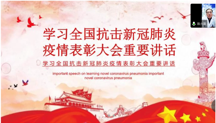 针对当前疫情,陈允震作了《抗疫斗争铸就伟大精神》《学习全国抗击新冠肺炎疫情表彰大会重要讲话》的主题报告,学习了全国抗击新冠肺炎疫情表彰大会中习近平总书记重要讲话精神,进一步鼓舞了援沪医疗队员的士气,激发起三位援沪同志坚守岗位、冲锋向前、团结奋斗、攻克疫情的强大意志力和战斗力。